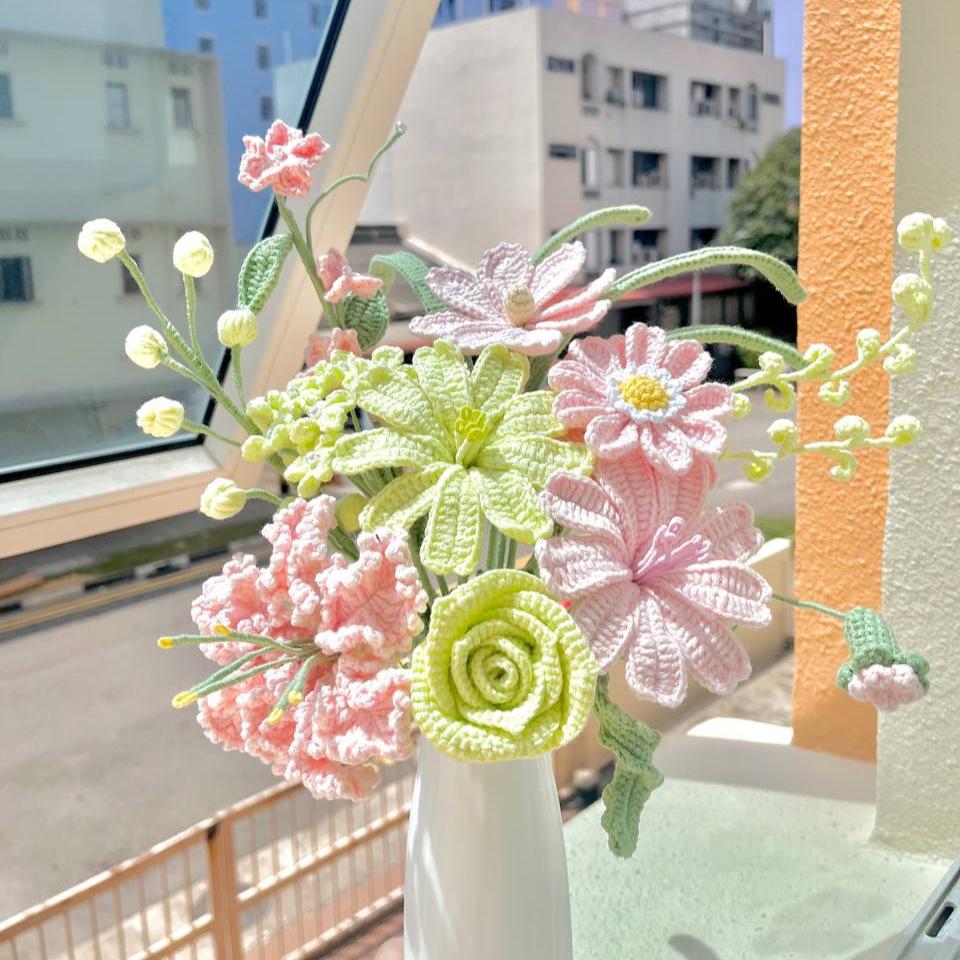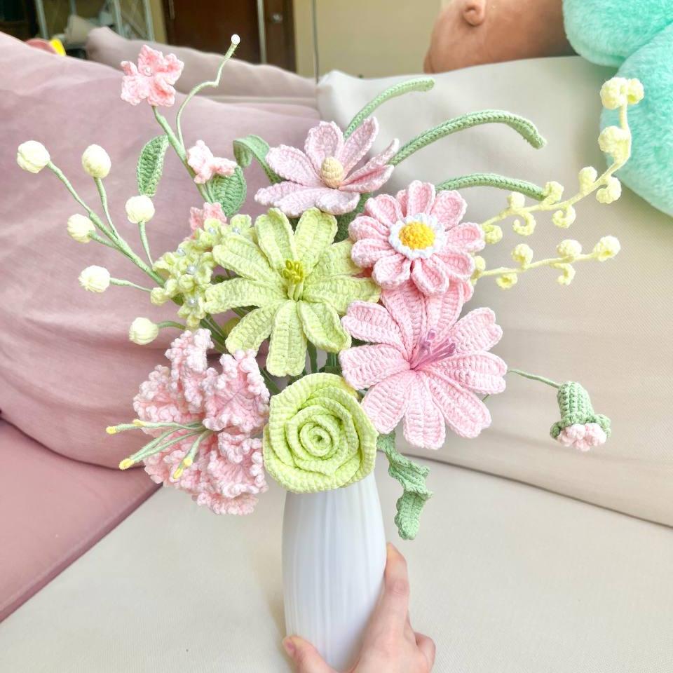Featuring a carefully curated selection of flowers, including Crape Myrtle, Wineglass Rose, Gerbera, Sakura, and Forget-Me-Nots, Emilia showcases a stunning variety of blooms that are crocheted with meticulous attention to detail. Each flower is thoughtfully crafted to bring out the beauty and uniqueness of nature, with soft, delicate petals and intricate textures. The result is a bouquet that not only stands out but also brings an inviting, fresh energy to any room.