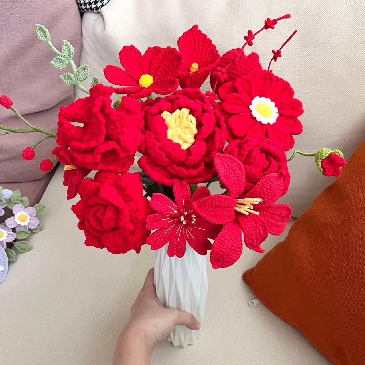 Transform your space with Enkai, a bold and captivating handcrafted crochet arrangement in stunning shades of red. This exquisite display showcases a vibrant mix of lilies, daisies, calla lilies, lavender, peonies, and a bed of exotic red blooms, creating a luxurious and eye-catching fusion of textures and colors.