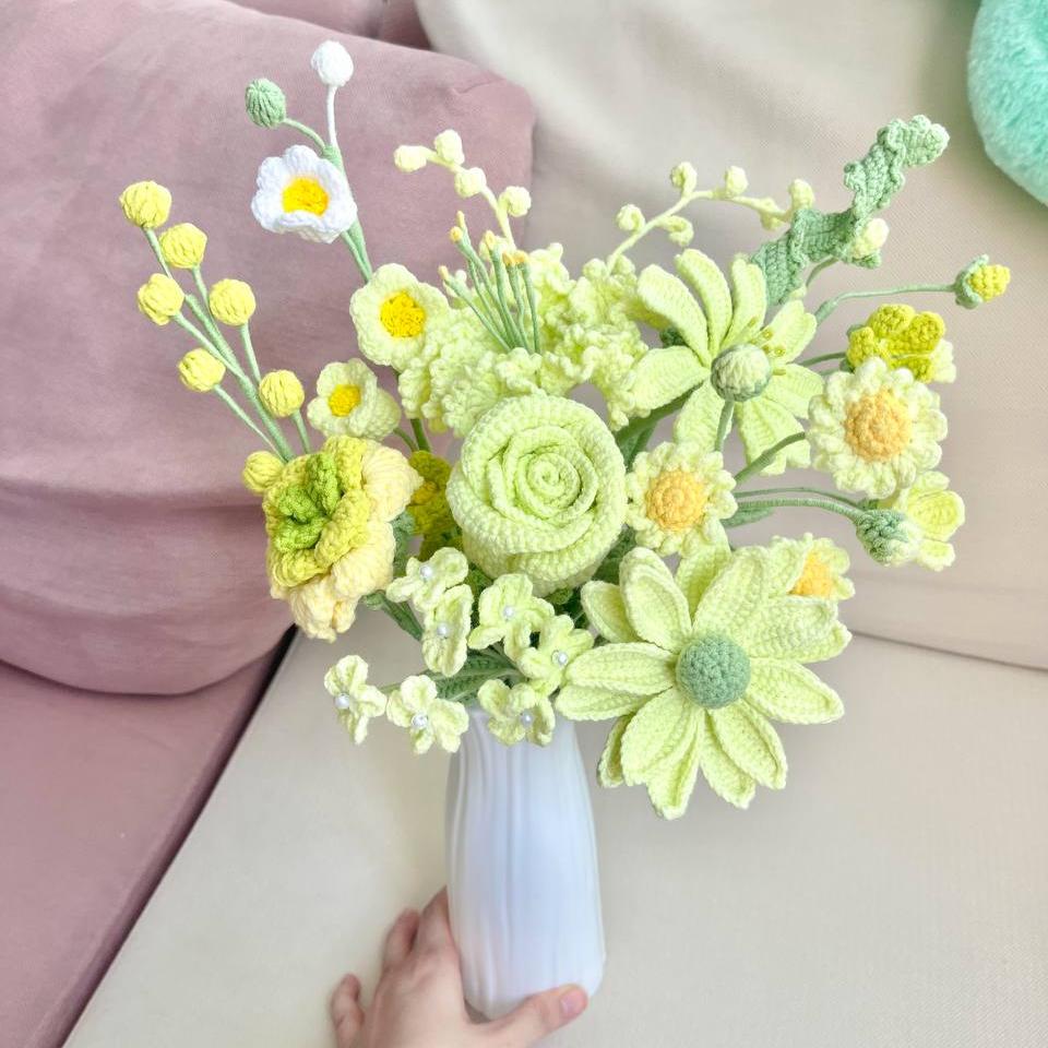 The arrangement features an exquisite mix of uniquely crocheted flowers, each one thoughtfully designed with intricate detail and artistry. Wineglass Roses, Lavender Daisies, Cliff Maid, Crape Myrtle, Lily of the Valley, and Mini Daisies come together to form a dynamic yet harmonious composition. Topped with an array of carefully crafted flower buds and leaves, the bouquet exudes natural beauty and refined elegance.